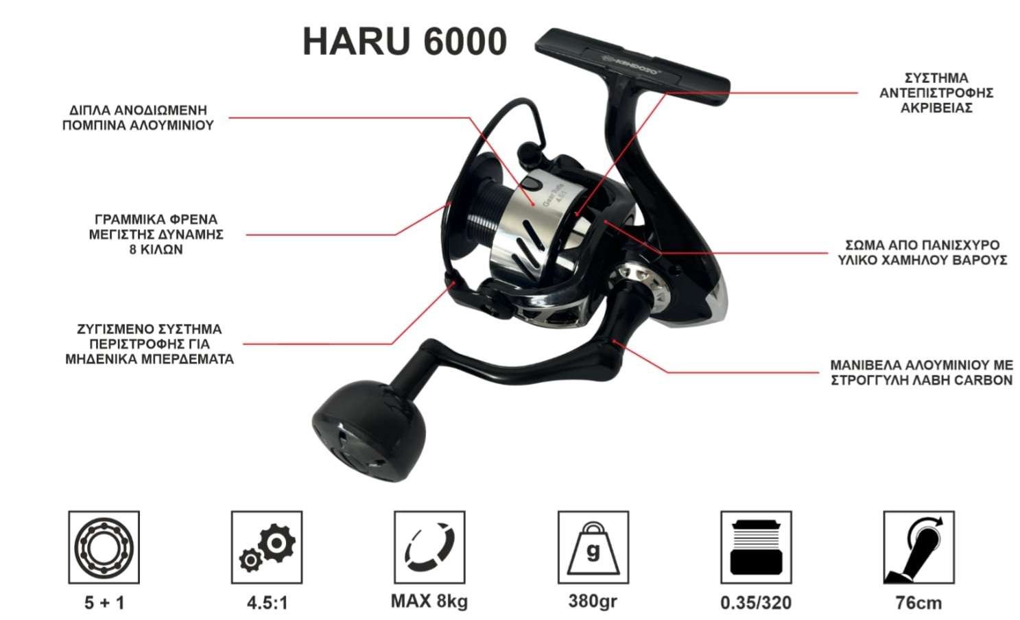 Νέο μοντέλο μηχανισμού Haru 6000 της Kendozo με χαρακτηριστικά που εντυπωσιάζουν για την κατηγορία του μηχανισμού. Κατασκευασμένος με ελαφρύ σώμα μικρού όγκου από γραφίτη και 6 ανοξείδωτα ρουλεμάν που του χαρίζουν μια απαλή περιστροφή ακόμα και με μέγιστο φορτίο έλξης. Ο μηχανισμός διακρίνεται και για το ειδικά σχεδιασμένο γραμμικό σύστημα φρένων μέγιστης δύναμης 8 κιλών, στοιχείο που θα συμβάλλει στα ψαρέματα από σκάφος και σε μεγαλύτερα βάθη. Η πομπίνα αλουμινίου αλλά και η ειδικά σχεδιασμένη στρογγυλή λαβή στη μανιβέλα είναι μερικά ακόμα στοιχεία που κάνουν την διαφορά για την κατηγορία τιμής του μηχανισμού!