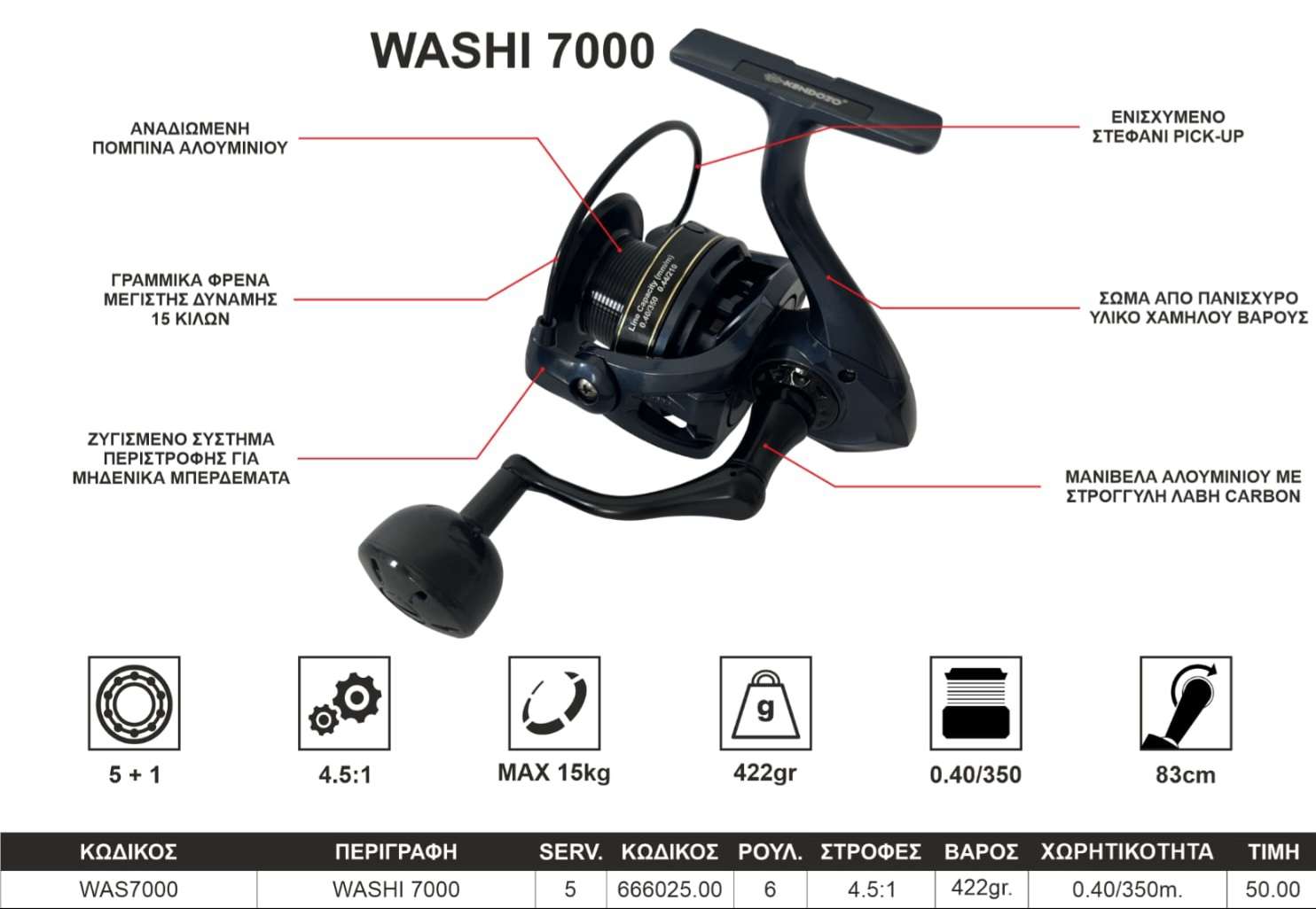 Το νέο μοντέλο μηχανισμού Washi 7000 της Kendozo διαθέτει χαρακτηριστικά τα οποία δίνουν λύση σε αρκετές συνθήκες ψαρέματος. Κατασκευασμένος από ελαφρύ σώμα μικρού όγκου από γραφίτη, 6 ανοξείδωτα ρουλεμάν αλλά και λόγο μεταβολής 4.5:1 ο οποίος χαρίζει την απαραίτητη δύναμη για μια απαλή περιστροφή ακόμα και σε δύσκολες συνθήκες. Εντυπωσιακό χαρακτηριστικό αποτελεί και το προηγμένο σύστημα φρένων που φτάνει την μέγιστη δύναμη των 15 κιλών! Επίσης, ιδιαίτερη προσοχή έχει δοθεί και στο σύστημα αδιαβροχοποίησης του μηχανισμού καθώς όλα τα εσωτερικά του μέρη προφυλάσσονται κατάλληλα από την διάβρωση που προκαλεί το θαλασσινό νερό. Η πομπίνα αλουμινίου αλλά και η ειδικά σχεδιασμένη στρογγυλή λαβή στη μανιβέλα είναι μερικά ακόμα στοιχεία που κάνουν την διαφορά αν αναλογιστεί κανείς και την κατηγορία τιμής του μηχανισμού!